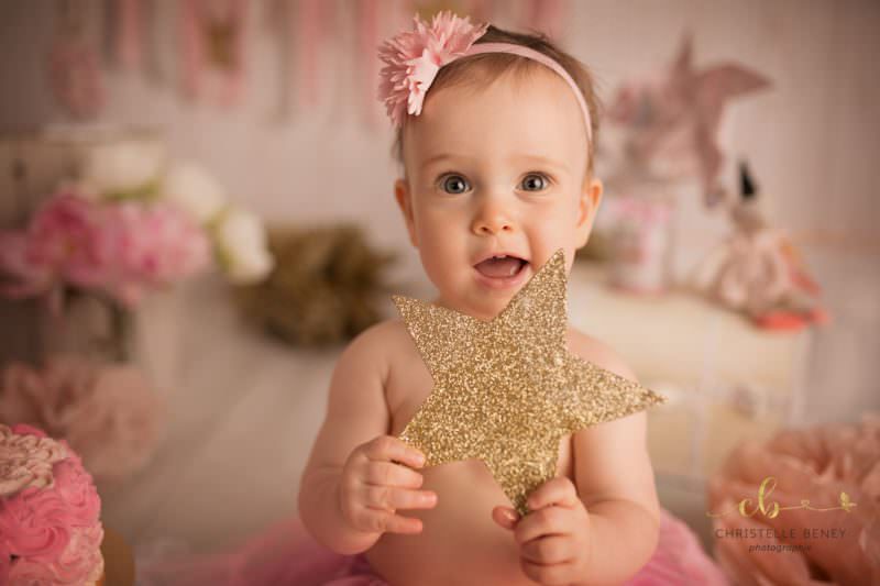 Emilie Rose, une douce petite fille au visage d’ange est venue souffler sa première bougie au studio.Sa maman souhaitait un univers doux, avec des dominantes de rose et d’or.