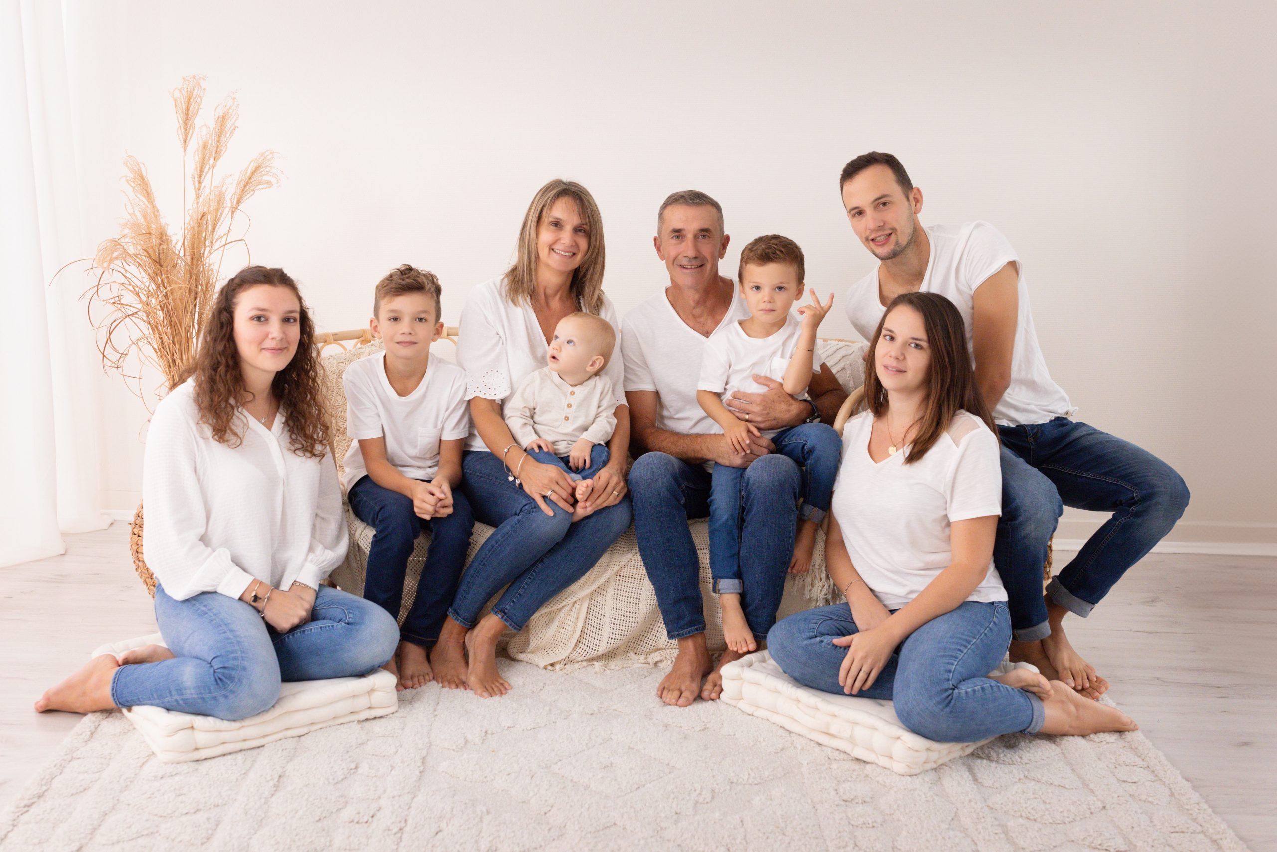 Ce type de séance est souvent réalisé en extérieur (ou sur un lieu symbolique pour votre famille), afin de profiter d’un espace plus vaste et d’une ambiance conviviale. C’est une belle occasion de réunir plusieurs générations et de créer des souvenirs communs à garder précieusement.