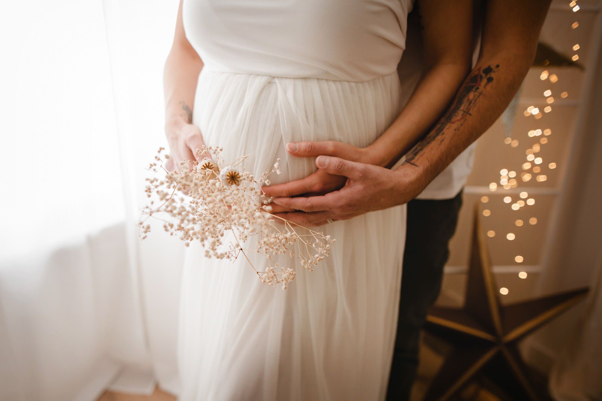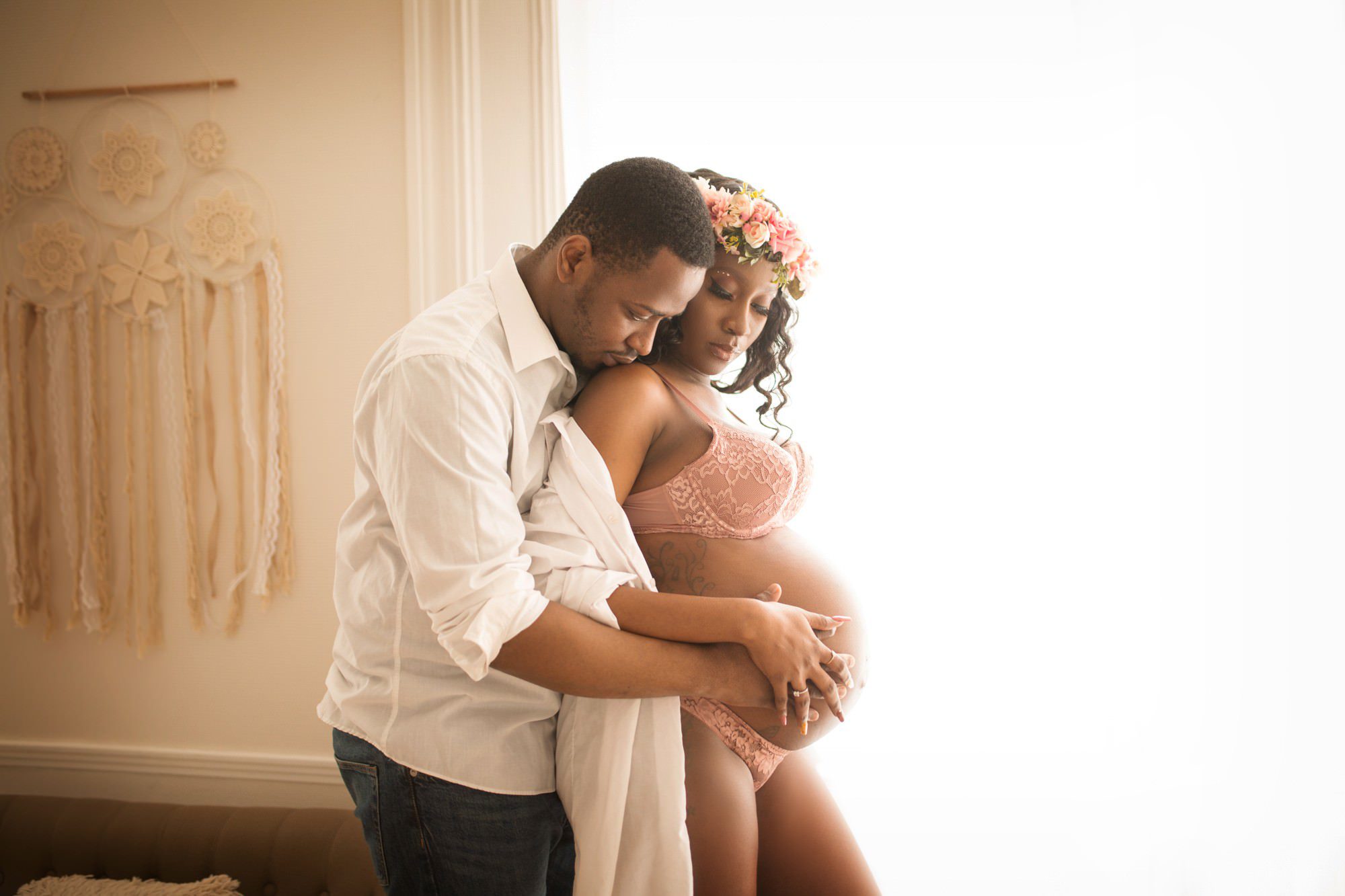 La séance se passe au studio, elle dure environ 1h30. Je réalise des mises en scène en lumière naturelle dans des univers cocooning comme à la maison. Mon studio s’y prête bien, je dispose d’un lit, un canapé, des fauteuils. Je vous guiderai tout le long de la séance, je mettrai en valeur votre ventre en fonction de votre morphologie.